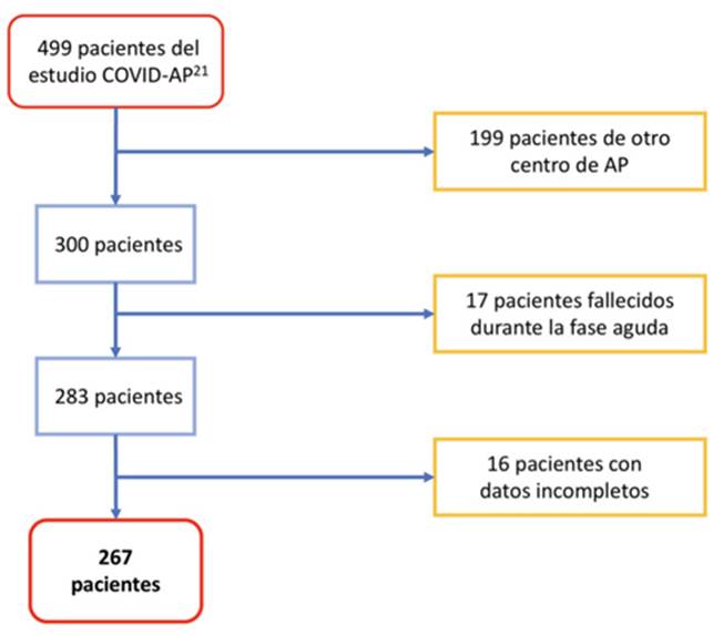 De los 499 pacientes originales del estudio COVID-AP20, 300 pertenecían al centro de salud de este estudio. Finalmente, de estos 300 pacientes, se analizaron 267 (figura 2).
