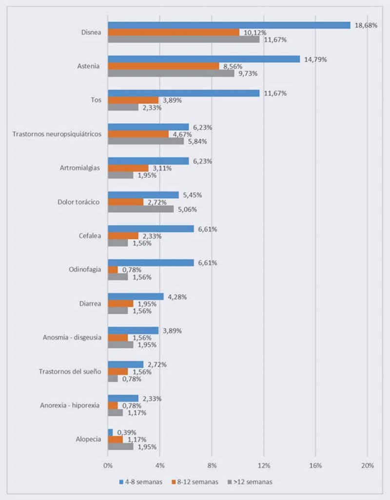 Después de 2 años de pandemia y más de 326 millones de casos de infección por COVID-19 confirmados en todo el mundo, los síntomas agudos de esta enfermedad han sido descritos ampliamente1. Tos, disnea, fiebre, odinofagia, anosmia, disgeusia, mialgia, diarrea, dolor en el pecho y dolor de cabeza son algunos de los múltiples signos y síntomas que los pacientes manifiestan en la fase aguda2-4. Esta fase aguda dura hasta 3 o 4 semanas, dependiendo de la gravedad de la enfermedad5,6.