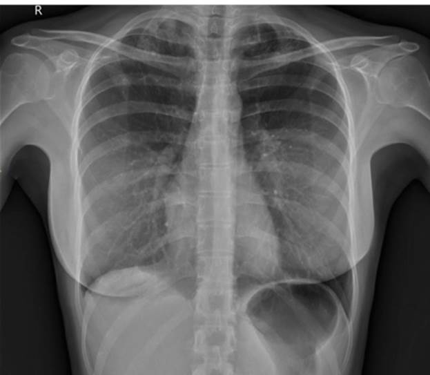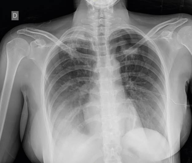 Mujer de 34 años natural de Almería, sin antecedentes de interés, que acude por fiebre de hasta 38,5 oC de predominio vespertino y pleurodinia derecha de 3-4 días de evolución con artralgias y mialgias asociadas. A su llegada, la paciente se encuentra afebril, normotensa, con frecuencia cardíaca en rango, saturando a aire ambiente a un 99% y con una exploración por aparatos anodina. En la analítica sanguínea destaca una proteína C reactiva de 11,34mg/dL, un dímero D de 944 y enzima convertidora de la amgiotensina de 61, con el resto de los parámetros de hemograma, bioquímica, coagulación, sedimento de orina y orina de 24 horas dentro de la normalidad. Reacción en cadena de poliomerasa SARS-CoV-2 negativo. La radiografía de tórax muestra un engrosamiento pleural y tractos fibrosos apicales bilaterales con un granuloma calcificado apical derecha y un mínimo pinzamiento del seno costofrénico derecho (figura 1). En el electrocardiograma se observa un ritmo sinusal a 79 lpm con un hemibloqueo incompleto de rama derecha.