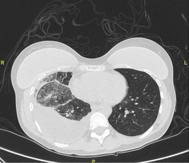 Con el fin de poder demostrar la presencia de granulomas caseificantes pleurales y confirmar histológicamente también la coexistencia del MTB como causante del derrame pleural derecho, se decidió hacer una biopsia pleural ciega guiada por ecografía torácica. Tras dos punciones infructuosas, la paciente presentó un cuadro súbito de hemoptisis franca autolimitada (15 mL), acompañado de cortejo vegetativo, por lo que se suspende la técnica y se demuestra por técnica de imagen un sangrado alveolar en lóbulo inferior derecho (LID) y LM sin sangrado activo actual (figura 4), probablemente debido a una punción pulmonar yatrogénica al hacer la punción pleural.
