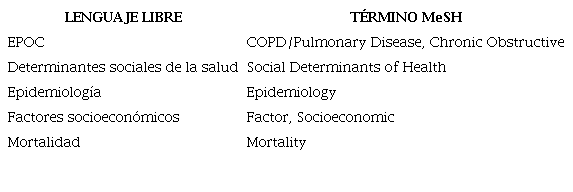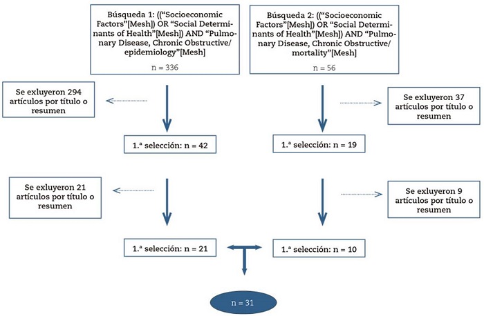La primera búsqueda incluyó las palabras claves: «determinantes sociales de la salud», «factores socioeconómicos» y «EPOC» con el subheading «epidemiología»: ((“Socioeconomic Factors”[Mesh]) OR “Social Determinants of Health”[Mesh]) AND “Pulmonary Disease, Chronic Obstructive/epidemiology”[Mesh]: La búsqueda arrojó 336 artículos, de los cuales, inicialmente, se seleccionaron 42.