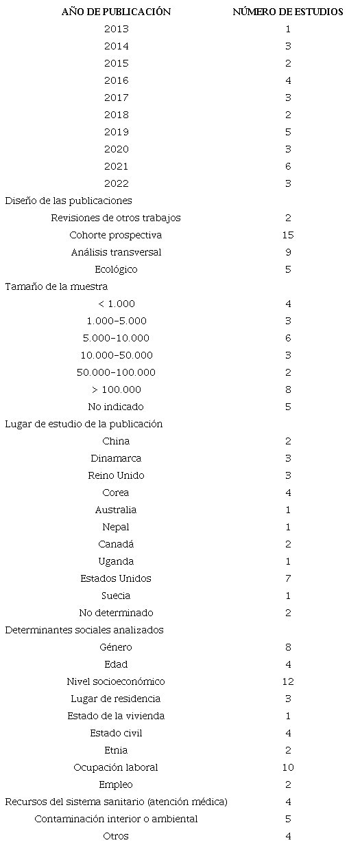 En la tabla 2 se muestra el número de estudios empleados según año de publicación, tipo de diseño, tamaño muestral, lugar de estudio, así como determinantes sociales analizados.