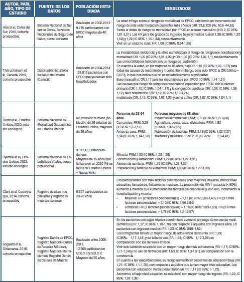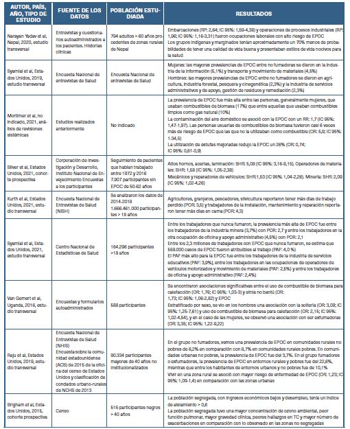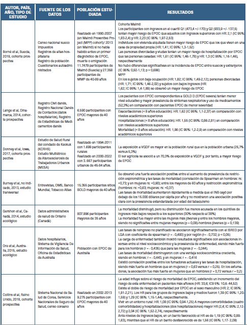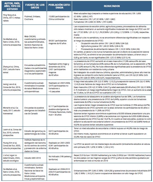 En la tabla 3 se detallan los principales hallazgos de las 31 publicaciones analizadas, evidenciando la relación entre los determinantes sociales de la salud y su impacto en la prevalencia y riesgo de EPOC, así como en la mortalidad.