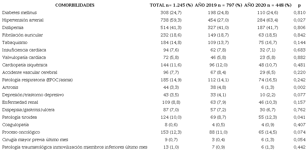 Results: a total of 1245 patients were included. Mean age was 71.2 (SD:13.7) years old and 51.1% were women. In 2019, 797 patients aged over 40 years of age were treated, while in 2020, the patients seen were 448, which represented a decrease of 43.79%. The prevalence of pulmonary embolism was higher in 2020 compared to 2019 (1.6% vs. 0.4%; P=0.024). The frequency of venous thrombotic events was also higher in 2020 compared to 2019 (1.35% vs. 0.4%; P=0.054). The overall prevalence of venous thromboembolic disease with composite variable (pulmonary thromboembolism + venous thrombosis) was statistically significantly higher in 2020 versus 2019 (2.9% versus 0.8%; P=0.003). None of our patients were diagnosed with COVID-19 and thromboembolism.