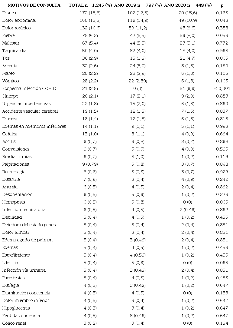 Como se observa en la tabla 3, los principales motivos de consulta durante el período de estudio de 2020 no fueron significativamente diferentes de los del año anterior, excepto los relacionados con infección por el virus SARS-CoV-2 y síntomas como la tos y el dolor abdominal (p < 0,05). Los principales motivos de consulta fueron disnea (13,8%), dolor abdominal (13,5%), dolor torácico (10,6%) y fiebre (6,3%).
