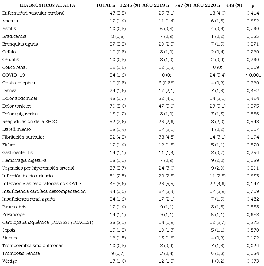 Los diagnósticos al alta del servicio de urgencias más frecuentes durante los dos años fueron dolor torácico (5,6%), fibrilación auricular (4,2%), infección respiratoria no COVID (3,9%) y dolor abdominal (3,7%), sin diferencias entre ambos años (tabla 4).