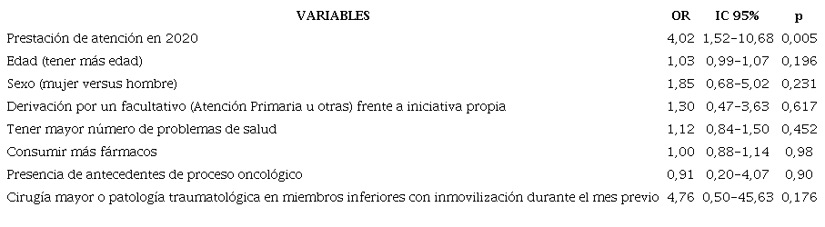 Mediante regresión logística, solo el año en el que se prestó la atención fue una variable asociada de forma independiente a la presencia de un evento tromboembólico agudo en pacientes atendidos en el servicio de urgencias (odds ratio [OR]: 4,022, IC 95%:1,52-10,68, p = 0,005). En la tabla 5 se muestran los resultados del análisis multivariante.
