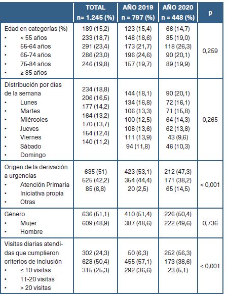 Durante el período de estudio, se incluyeron un total de 1.245 pacientes que cumplieron los criterios de inclusión. Frente a las 797 personas del mismo período del año 2019, se atendieron 448 en 2020, mostrando un descenso del 43,79%. El 51,1% del total fueron mujeres y la edad media fue de 71,2 (DE: 13,7) años. La media diaria de visitas atendidas en urgencias de personas mayores de 40 años que cumplían criterios de inclusión fue 16,0 (rango: 4-31 visitas al día), siendo significativamente superior en 2019 respecto a 2020 (18,8 visitas frente a 11,0; p < 0,01). En la tabla 1 se muestran las características generales de los participantes en función del año en el que se prestó la atención sanitaria.