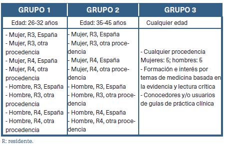 Se crearon tres grupos focales, dos de ellos se hicieron tomando como eje de clasificación la edad y la procedencia buscando el discurso general de los residentes de nuestras unidades docentes, y un tercero buscaba el discurso de los residentes que contaban con mayores habilidades en el uso de tecnologías, y eran usuarios habituales de las GPC para poder captar las diferencias discursivas. Se invitó a participar a 10 residentes en cada grupo para garantizar que se conseguía el número recomendado de 6-8 sujetos por grupo, acudiendo a las sesiones un total de 28 residentes. El número de grupos se decidió en función de un criterio de saturación del discurso. La duración fue de 90-120 minutos.