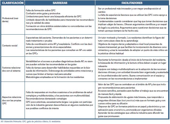 Results: The barriers related to training were the training model received to acquire the necessary skills, the lack of knowledge to evaluate the quality of guidelines and a limited knowledge of the search engines. Among the barriers related to social context and health system, conflict with the patient’s expectations or with the recommendations of other specialists, the characteristics of patients who consult in primary care and the limited time available for consultations were all identified. Personal motivation, the tutor’s knowledge and professional practice model and clear, brief CPGs and in various formats were all identified as facilitators.