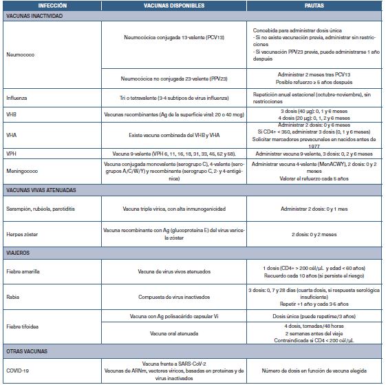 Indicada la vacunación de neumococo (A-II), gripe anual (A-II), SARS-CoV-2 (A-II), virus de la hepatitis B (VHB) con dosis altas (A-I) y determinación de respuesta serológica posvacunal (B-I), virus de la hepatitis A (VHA) (A-I), virus del papiloma humano (VPH) (A-III) y herpes zoster (B-I) (tabla 6).