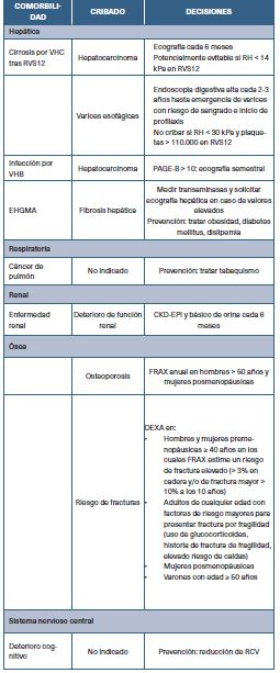 En pacientes con infección por el VIH, se deben evaluar en cada visita clínica (tanto de AH como de AP) las diferentes comorbilidades hepáticas, renales, óseas, pulmonares o del sistema nervioso central (SNC), realizando los cribados preventivos y modificando si es necesario los hábitos de vida, el TAR y tratando específicamente la entidad (A-I) (tabla 8).