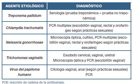 Cribado de sífilis anualmente si hay relaciones sexuales no protegidas (B-II), y en el colectivo de gays, bisexuales y otros hombres que tienen sexo con hombres (GBHSH) con factores de riesgo, monitorizar al menos N. gonorrhoeae, C. trachomatis y virus de la hepatitis C (C-II). El cribado se hará cada 3-6 meses según los factores de riesgo.