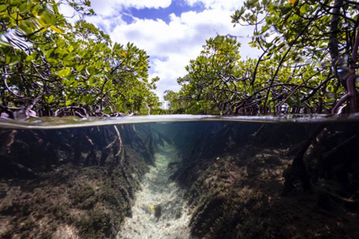 Significa árbol retorcido. Es un bosque salado. Un manglar es un conjunto de árboles caracterizado por su habilidad para sobrevivir y desarrollarse en terrenos costeros inundados o inundables, zonas con agua de altos niveles de salinidad. Es el equivalente costero del bosque selvático en tierra. Tienen una grandísima diversidad biológica, encontrándose tanto gran número de especies de aves como de peces. Actúan como barrera para la erosión y proporcionan una protección natural contra catástrofes naturales del tipo de fuertes vientos y olas producidas por huracanes.