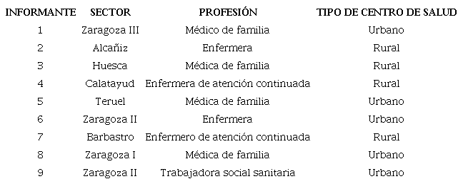 Estudio cualitativo descriptivo a través de entrevistas semiestructuradas a profesionales de EAP de la región implicados con la RA. Se analizó la opinión de profesionales de AP que cumplían los siguientes criterios de inclusión: pertenecer a un EAP con Agenda Comunitaria avanzada creada desde 2017 hasta 2020, y que hubiera hecho RA formal a través del protocolo vinculado a la historia de salud digital. Las entrevistas se llevaron a cabo durante el año 2021. Se hizo un muestreo intencional, buscando que estuviesen representados distintos perfiles de profesionales. Para la selección de informantes clave, se revisaron por tanto dos fuentes de información: las Agendas Comunitarias avanzadas en las que se afirmaba que se realizaba RA y el listado de profesionales que con más frecuencia hacen RA formal a través de la historia de salud digital. Se obtuvo una lista de 26 profesionales que hacían RA formal y cuyos centros de salud disponían de Agenda y habían participado en ella. A partir de aquí, se hizo una segunda selección teniendo en cuenta: la categoría profesional, el sector sanitario de trabajo y si se hace la asistencia en un EAP rural o urbano. Fueron revisados por integrantes del grupo técnico de la EACA, que hicieron una selección de nueve profesionales, obteniendo una muestra representativa en cuanto a las características mencionadas, como se muestra en la tabla 1. Se contactó con las y los informantes clave por correo electrónico, enviándoles carta formal de invitación; todos aceptaron participar y firmaron el consentimiento informado. El estudio contó con la aprobación del Comité de Ética de Investigación Clínica de Aragón (PI20/606).