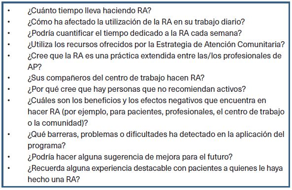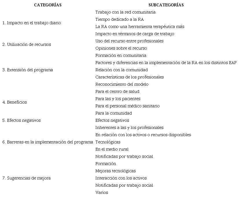 Resultados: surgieron temas relacionados con siete categorías: impacto en el trabajo diario, uso de recursos disponibles, extensión del programa, beneficios y efectos negativos de la RA, barreras en la implementación y sugerencias de mejora. Plantearon como condición esencial conocer la red comunitaria antes de desarrollar cualquier programa de RA para poder hacerlo de manera efectiva. Para ello, valoran positivamente las herramientas proporcionadas por la Estrategia de Atención Comunitaria, aunque precisan de algunas mejoras para facilitar su uso y disminuir el impacto en carga de trabajo. Se demostró la necesidad de mejora en la coordinación con trabajo social, así como la unificación de protocolos que ya utilizan estos profesionales.