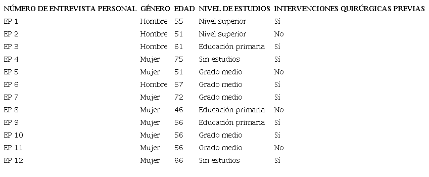 Todas las entrevistas, menos una, se hicieron en la biblioteca del centro de salud y la duración media fue de 45-60 minutos. De las 12 entrevistas, 11 fueron grabadas y transcritas, con la autorización previa de las y los pacientes. Una entrevista tuvo que hacerse de forma telefónica, al encontrarse el paciente desplazado en casa de un familiar, y no pudo grabarse, pero se tomaron notas y se incluyó la información para su análisis. Una paciente, la de mayor edad (72 años), acudió acompañada de su hija, tanto a los grupos focales como a la entrevista personal, porque se sentía más cómoda y segura teniéndola a su lado y porque esa hija era quien le daba soporte en todo lo relacionado con la asistencia sanitaria.