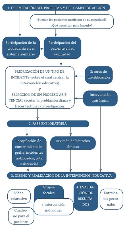 Tras seleccionar y estudiar el tipo de incidente de seguridad sobre el que implicar a las y los pacientes (errores de identificación del paciente) y el proceso asistencial en el que aplicar la intervención educativa (intervención quirúrgica programada del servicio de traumatología), se diseñó el material para sensibilizar y activar a las personas en tratamiento (figura 1). Los y las pacientes participantes en el estudio recibieron una intervención educativa al inicio del proceso asistencial seleccionado, dirigida a promover su participación a favor de su seguridad durante la asistencia19. La aplicación de los grupos focales en esta fase de la investigación permitió contrastar la calidad del material formativo diseñado para la intervención y conocer la situación de partida de las y los pacientes, su percepción y sus conocimientos sobre la seguridad de la asistencia al inicio del proceso asistencial20. Al final del proceso se les hizo una entrevista personal semiestructurada, siendo esta la herramienta de análisis de los resultados de la intervención.