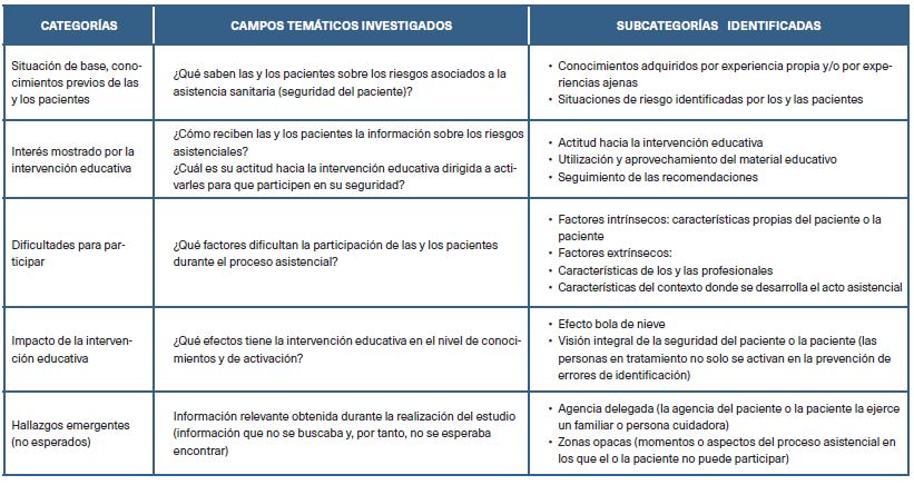 Se entrevistó a 12 de las 17 personas participantes del estudio, 8 mujeres y 4 hombres, con edades comprendidas entre los 46 y los 72 años (tabla 1). Se utilizó un guion de preguntas con los principales aspectos que explorar, lo que ayudó a conducir las entrevistas y facilitó el posterior análisis de contenido y segmentación temática. Se identificaron cinco categorías de análisis: percepción de los riesgos asociados a la asistencia sanitaria, interés mostrado por la actividad educativa, dificultades para poder participar, utilidad e impacto real en la capacidad de las y los pacientes para participar reforzando su seguridad durante la asistencia, y «otros hallazgos» (tabla 2).