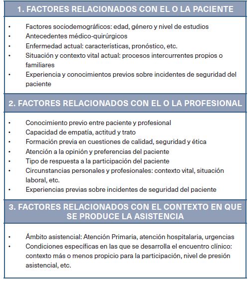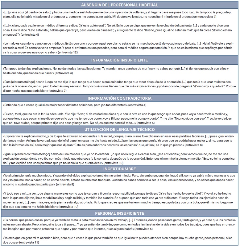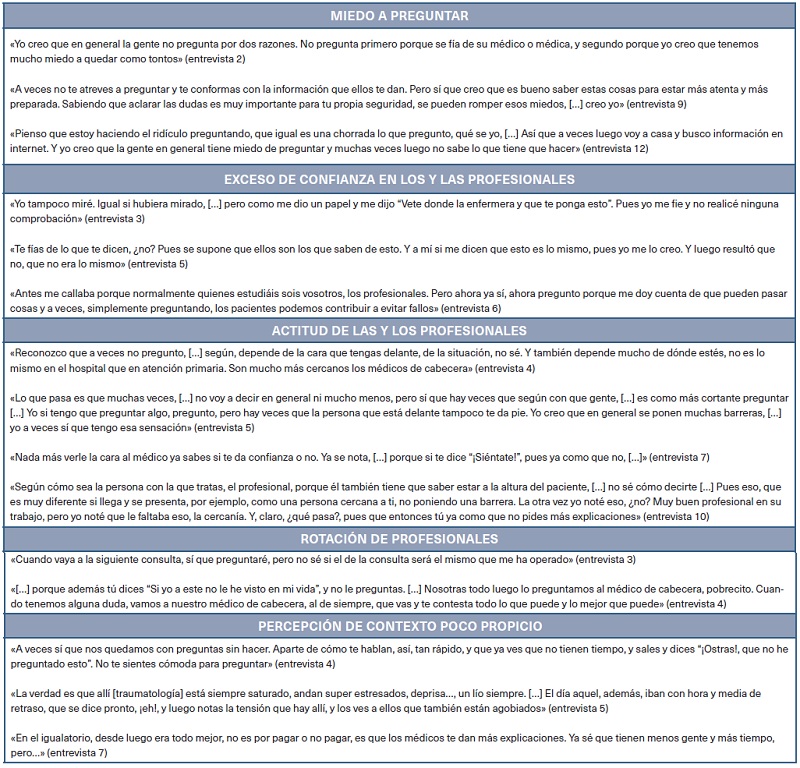 Estos aspectos, detallada y específicamente desarrollados en la tabla 3, señalan las lagunas de información y las fuentes de dudas que tienen las y los pacientes en relación con el proceso asistencial, que deberían ser abordados por parte del personal médico sanitario tanto para mejorar la calidad de la asistencia como para promover la participación de las y los pacientes.