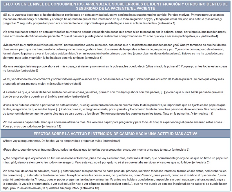 Todas las personas participantes han manifestado su intención de cambio en futuros contactos con el sistema sanitario, y creen que la intervención educativa ha mejorado su disposición y capacidad para actuar reforzando su seguridad. Entre los elementos que señalan como más relevantes destacan la importancia de estar más al tanto de los aspectos y detalles de su proceso asistencial, preguntar las dudas y solicitar la información necesaria para conseguir aclararlas, así como adoptar una actitud más activa y participativa en general.