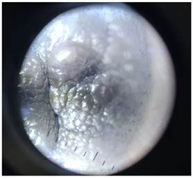 En la dermatoscopia se observan unos pequeños cuerpos globulares marrones bien definidos distribuidos por la lesión que aparentan ser glándulas (figura 2).