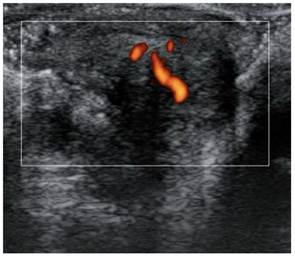 En la ecografía cutánea y abdominal no se ve ninguna otra lesión, excepto un nódulo de 1,5 cm de diámetro por 2 cm bien delimitado supraaponeurótico. Tampoco se manifiestan hernias abdominales ni umbilicales. En el Doppler ecográfico se aprecia vascularización central (figura 3).