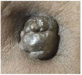 Acude por una lesión lobulada de aproximadamente 2 cm que aparece prominente en la región umbilical de color rojizo-marrón-amoratado, erosionada, sangrante y que tapona todo el orificio del ombligo (figura 1).
