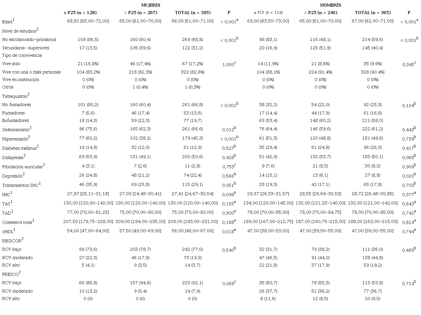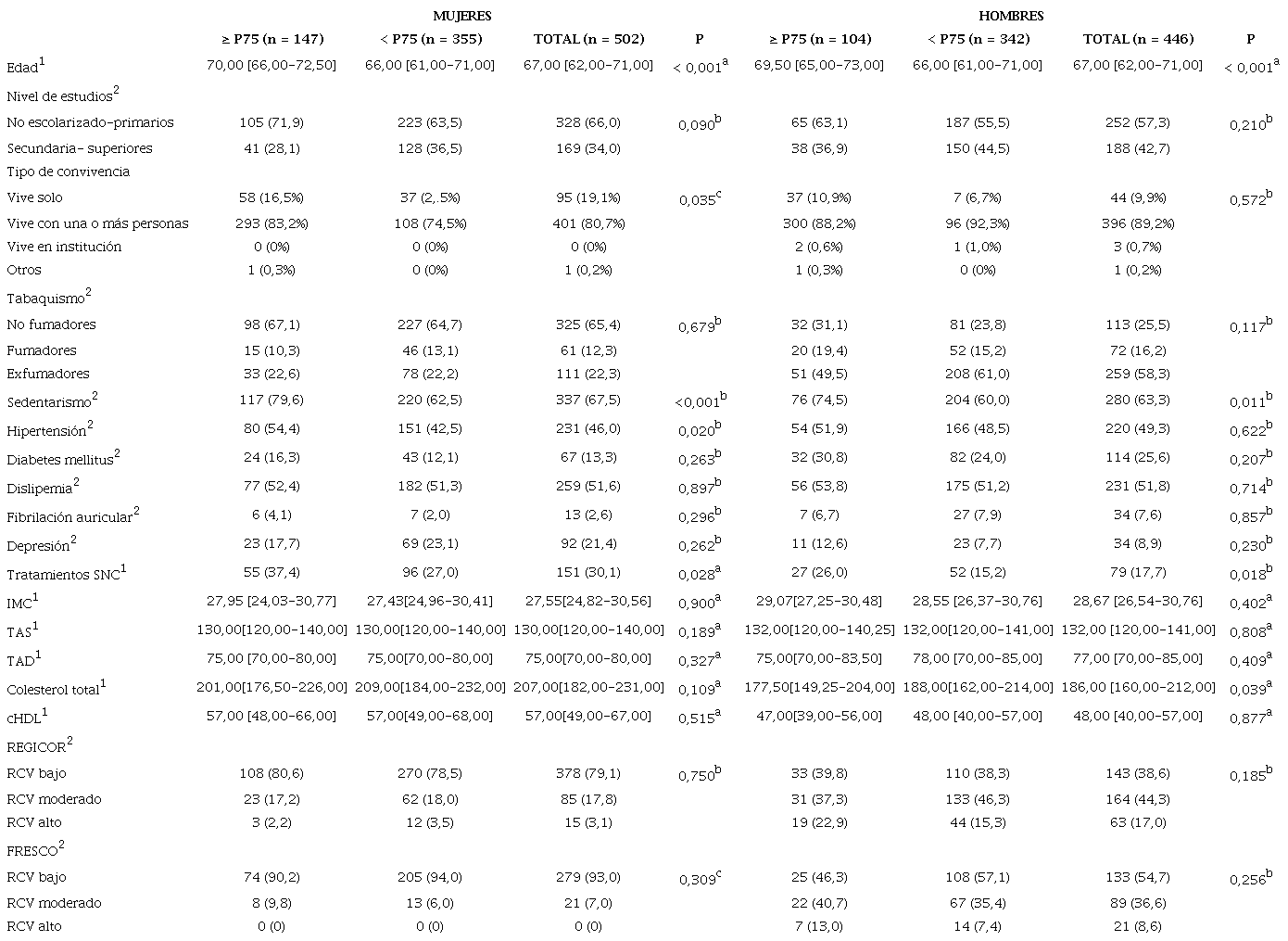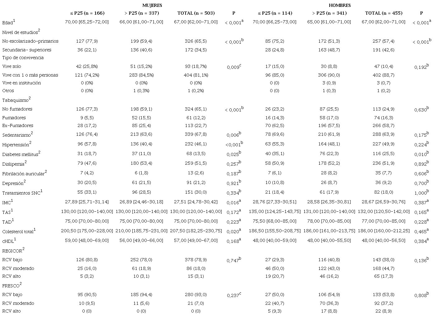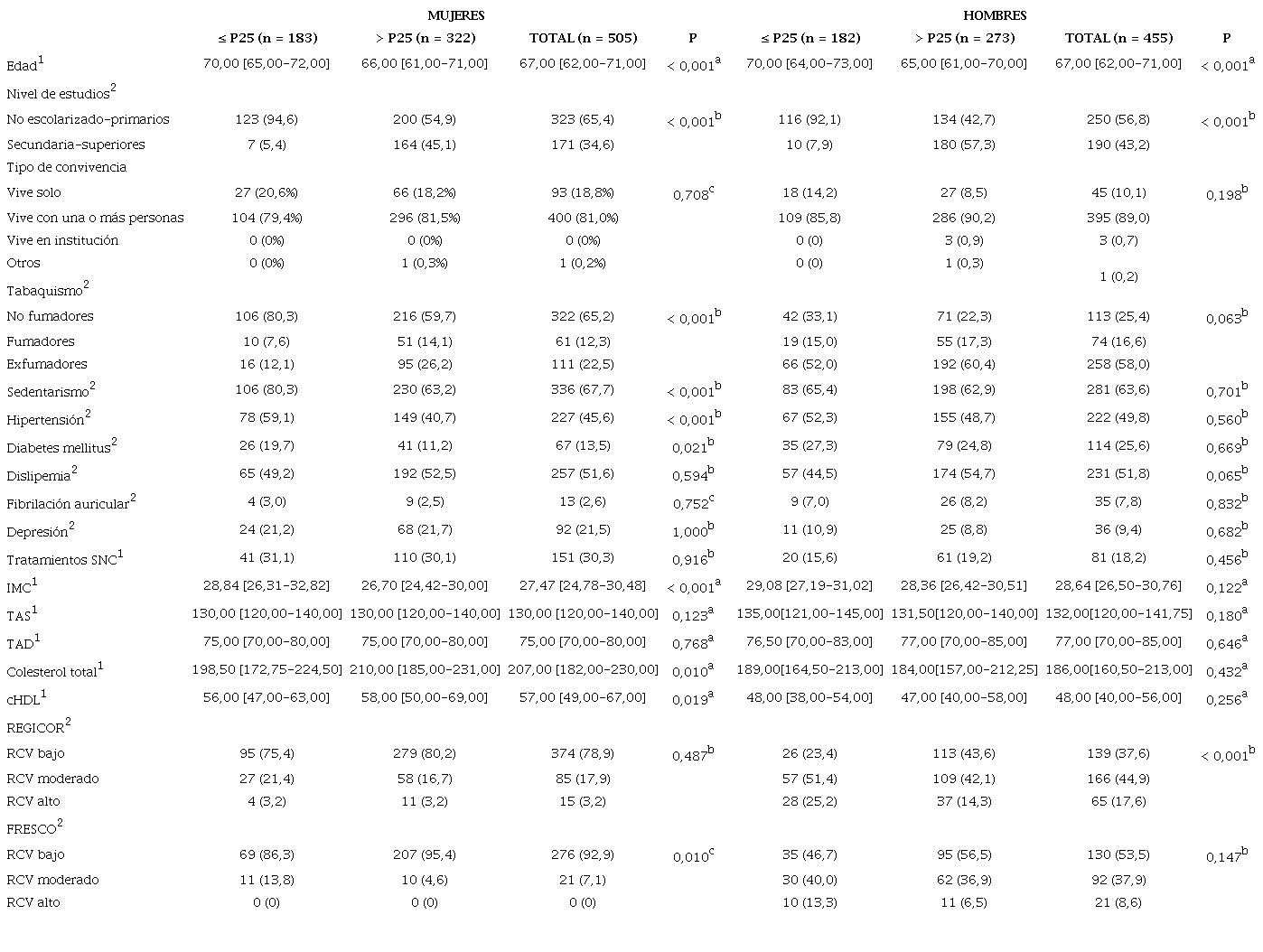 Las características sociodemográficas, estilo de vida y clínicas se describieron mediante sus frecuencias y porcentajes para las variables cualitativas y su mediana y rango intercuartílico (RIQ) para las cuantitativas. Posteriormente, se compararon las variables, estratificadas por sexo, mediante las pruebas de chi-cuadrado o U de Mann-Whitney, según el tipo de variable.