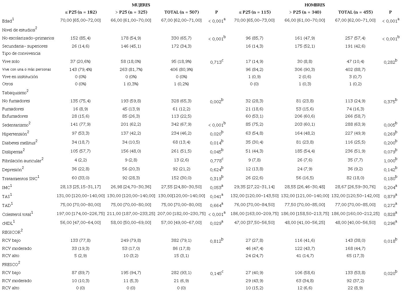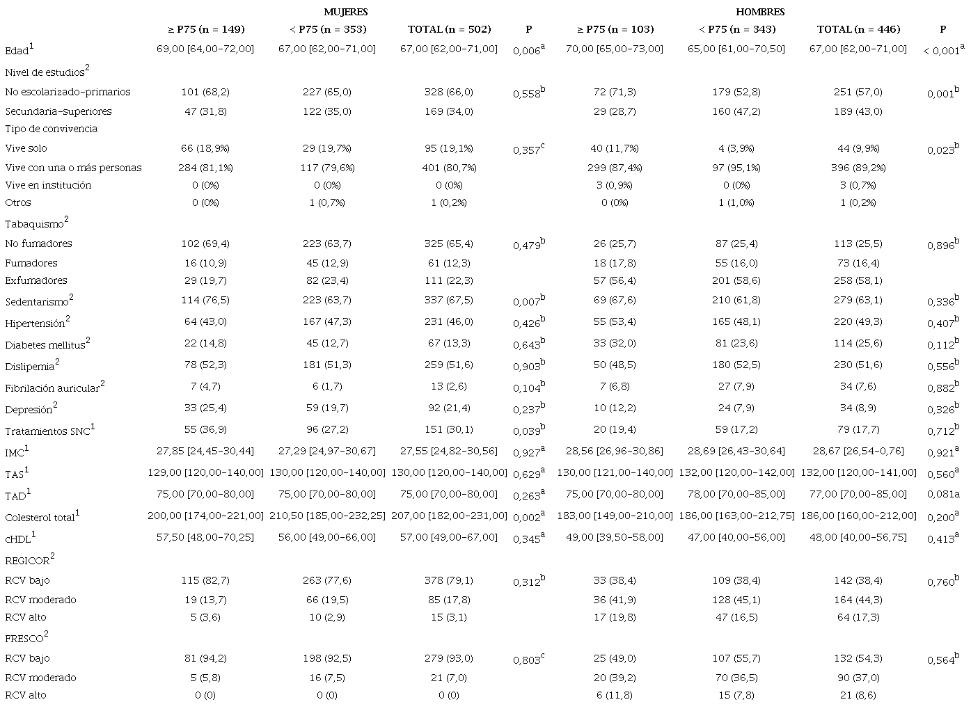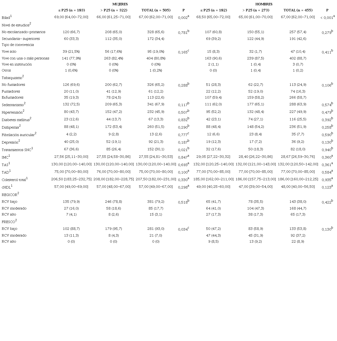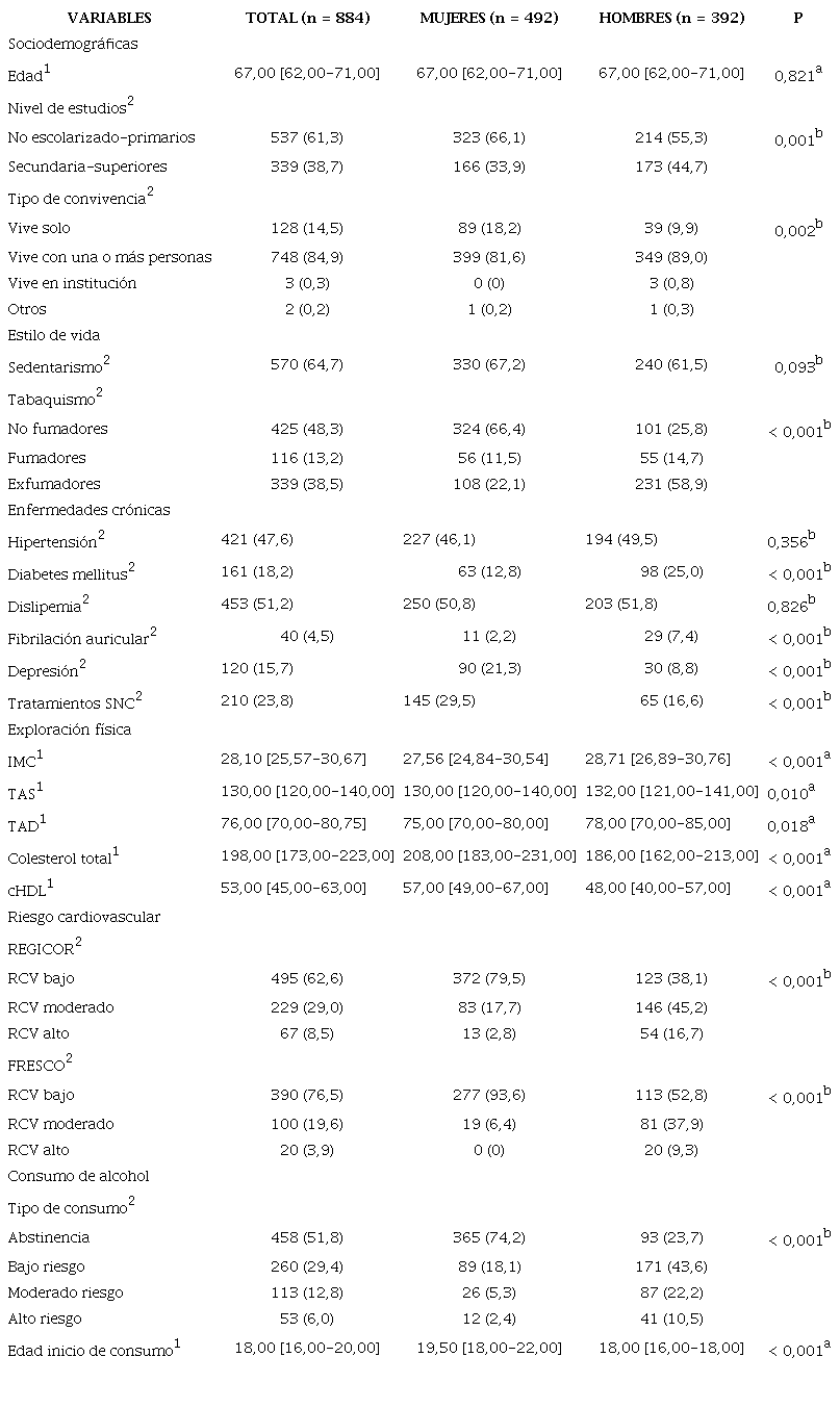 La cohorte NEDICES2-RISK incluyó a 884 participantes (55,7% mujeres) con una mediana de edad de 67 años (RIQ: 62,00-71,00). Un mayor porcentaje de mujeres en comparación con los hombres presentaban un menor nivel de estudios (66,1% vs. 55,3%) y vivían solas (18,2% vs 9,9%). En relación con el estilo de vida, las mujeres eran más sedentarias (67,2% vs. 61,5%), mientras que el porcentaje de fumadores y exfumadores era mayor en los hombres (73,6% vs. 33,6%). En relación con las comorbilidades, los hombres respecto a las mujeres presentaban un mayor porcentaje de HTA (49,5% vs. 46,1%), DM (25,0% vs. 12,8%), dislipemia (51,8% vs. 50,8%) y FA (7,4% vs. 2,2%), mientras que hubo un mayor número de mujeres con diagnóstico de depresión (21,3% vs. 8,8%) y una mayor prescripción de tratamientos que afectaban al SNC (29,5% vs. 16,6%). El RCV fue alto según la función REGICOR en el 16,7% de los hombres frente al 2,8% de las mujeres, mientras que, según la ecuación FRESCO, solo lo fue el 9,3% en los hombres (tabla 1).