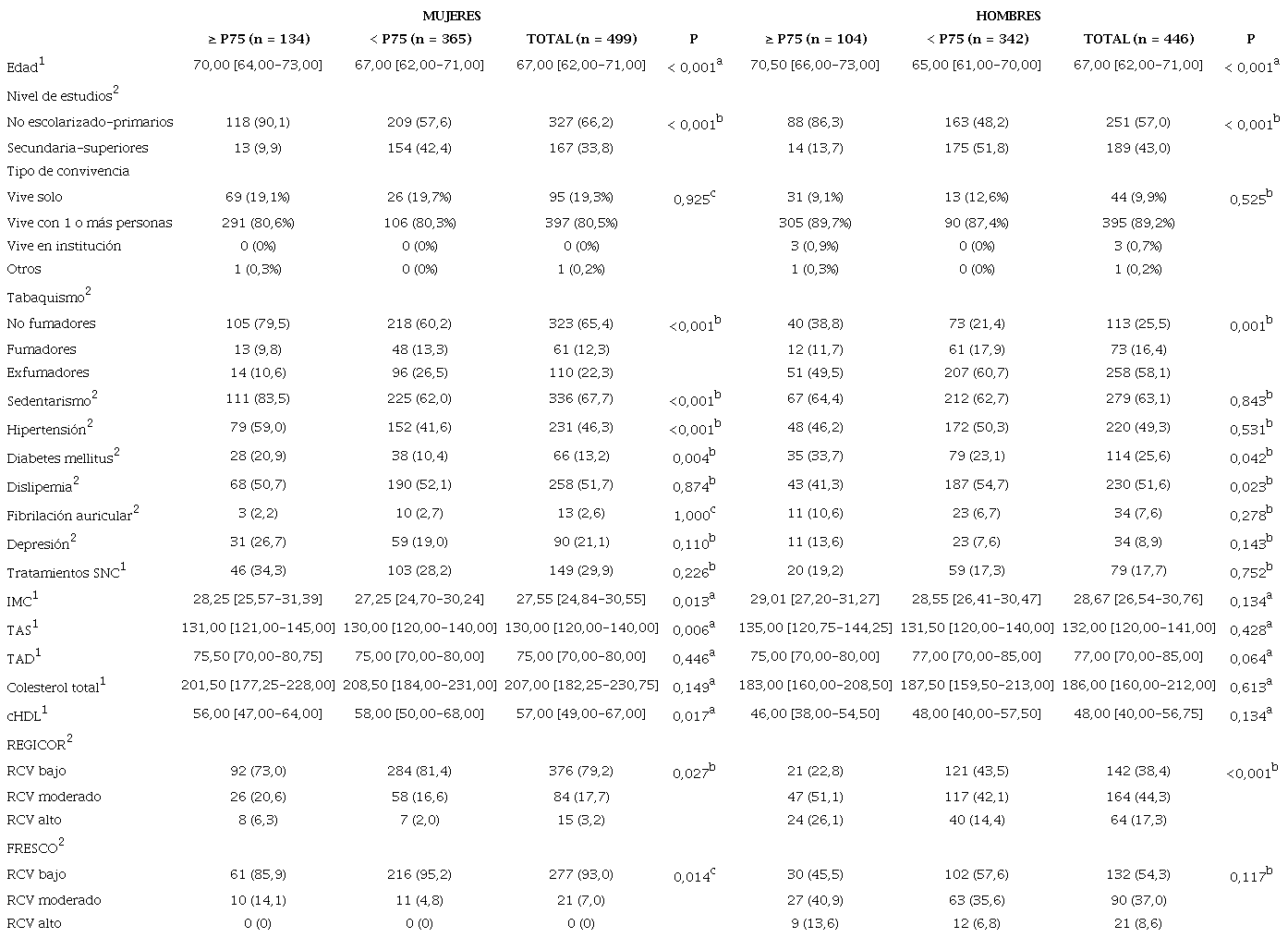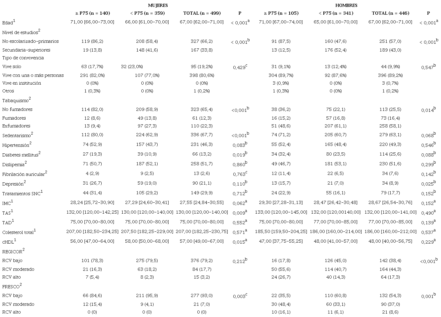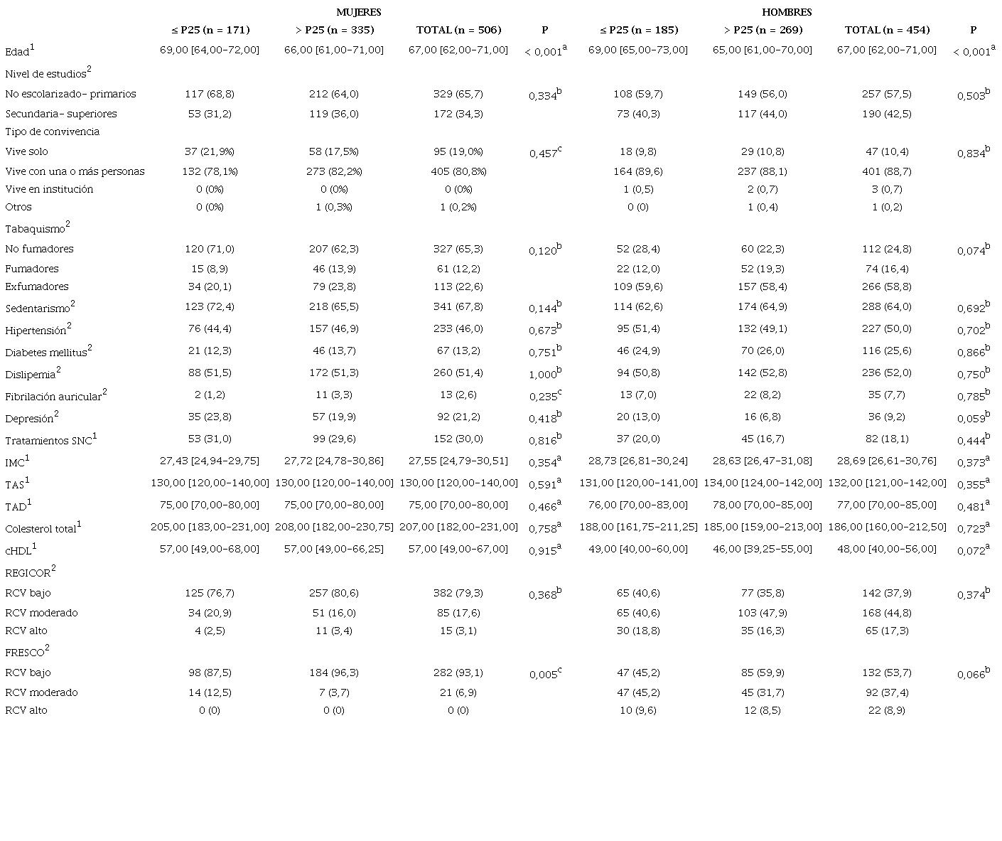 La cohorte NEDICES2-RISK incluyó a 884 participantes (55,7% mujeres) con una mediana de edad de 67 años (RIQ: 62,00-71,00). Un mayor porcentaje de mujeres en comparación con los hombres presentaban un menor nivel de estudios (66,1% vs. 55,3%) y vivían solas (18,2% vs 9,9%). En relación con el estilo de vida, las mujeres eran más sedentarias (67,2% vs. 61,5%), mientras que el porcentaje de fumadores y exfumadores era mayor en los hombres (73,6% vs. 33,6%). En relación con las comorbilidades, los hombres respecto a las mujeres presentaban un mayor porcentaje de HTA (49,5% vs. 46,1%), DM (25,0% vs. 12,8%), dislipemia (51,8% vs. 50,8%) y FA (7,4% vs. 2,2%), mientras que hubo un mayor número de mujeres con diagnóstico de depresión (21,3% vs. 8,8%) y una mayor prescripción de tratamientos que afectaban al SNC (29,5% vs. 16,6%). El RCV fue alto según la función REGICOR en el 16,7% de los hombres frente al 2,8% de las mujeres, mientras que, según la ecuación FRESCO, solo lo fue el 9,3% en los hombres (tabla 1).