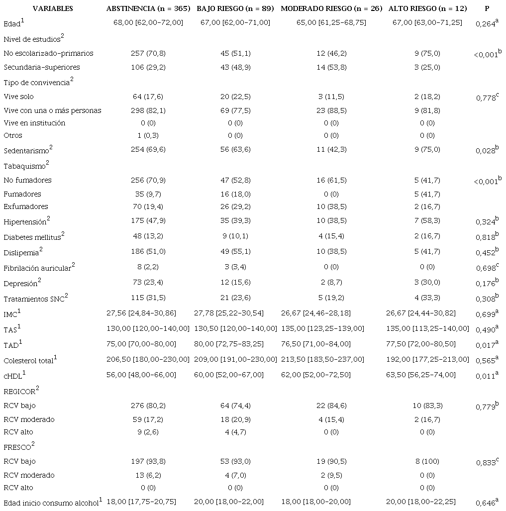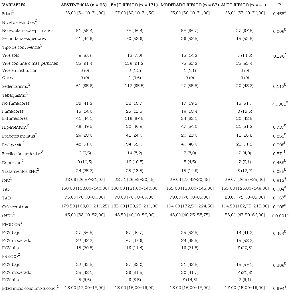 Las características basales se compararon entre los cuatro niveles de consumo de alcohol mediante las pruebas de chi-cuadrado o exacta de Fisher y Kruskal-Wallis o U de Mann-Whitney, debido a la distribución no normal de todas las variables examinadas, incluidas las puntuaciones de las pruebas neuropsicológicas. Se emplearon los mismos métodos estadísticos para comparar el rendimiento en las distintas pruebas neuropsicológicas y las características de la cohorte al inicio del estudio, estratificadas por consumo de alcohol y rendimiento cognitivo.