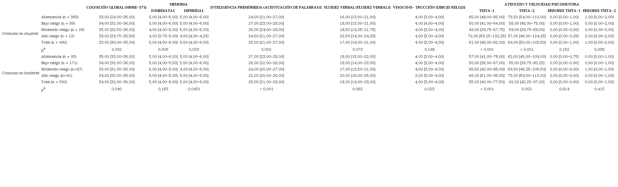 Los diferentes niveles de consumo de alcohol se describieron comparando el cuartil más bajo de la muestra (el peor) en términos de rendimiento cognitivo frente al resto (≤ P25 vs. > P25 en todas las pruebas, excepto en la TMTA, donde el cuartil ≥ P75 indica el peor rendimiento). Todos los resultados de los análisis se estratificaron por sexo.