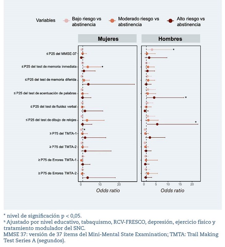 En mujeres, un consumo moderado de alcohol, en comparación con la abstinencia, se asoció a peores puntuaciones en el test de recuerdo inmediato (OR: 3,62; IC 95%: 1,35-10,37). El consumo de bajo riesgo frente a la categoría de abstinencia se asoció con un mejor desempeño en el tiempo de ejecución de la prueba TMTA-1 (OR: 0,27; IC 95%: 0,07-0,78).