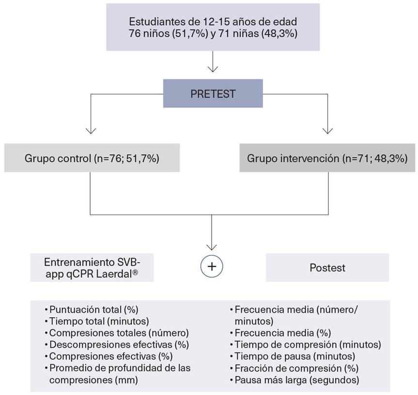Se incluyeron 76 niños (51,7%) y 71 niñas (48,3%), donde el 48,3% pertenecieron al grupo intervención y el 51,7% al grupo control. El rango de edad fue de 12-15 años y la mediana de edad de los participantes fue de 13 (RIQ = 1) años. Todas las personas participantes completaron la formación y evaluación en RCP.