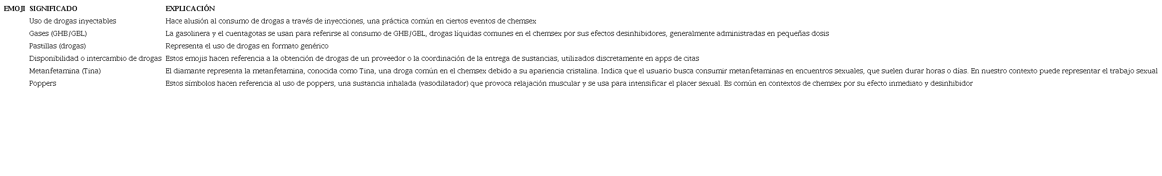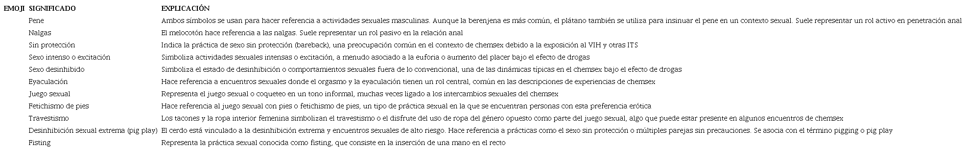 El uso de emojis no solo facilita la comunicación rápida, sino que también crea un código implícito que es comprendido por los participantes habituales, pero no siempre por usuarios ajenos a la cultura del chemsex. Este código enriquece el argot integrando símbolos digitales con significados que van más allá de lo literal, y que a menudo implican el consumo de sustancias específicas o tipos de encuentros sexuales8.