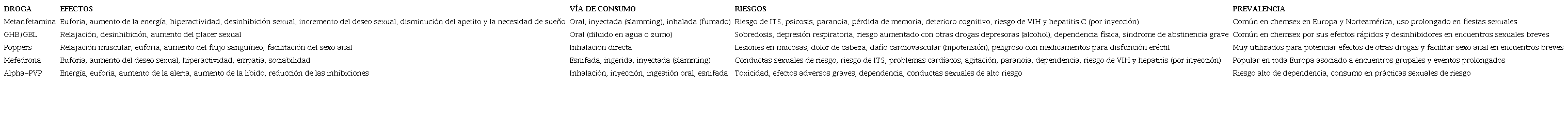 El fenómeno del chemsex está asociado al uso de diversas sustancias que potencian las sensaciones sexuales y permiten encuentros prolongados12. Estas drogas, tanto estimulantes como depresoras, tienen efectos que facilitan la interacción social y sexual, pero también conllevan riesgos significativos para la salud. En la tabla 3 se presentan las principales drogas13 utilizadas en este contexto.