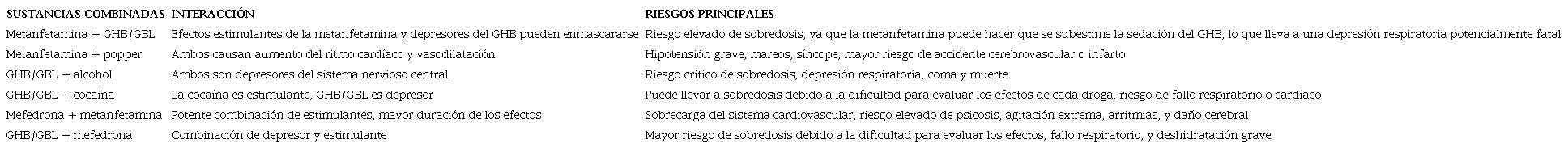 Otro gran problema son las interacciones entre sustancias, teniendo en cuenta que en numerosas ocasiones se utilizan fármacos que aumentan la potencia sexual (inhibidores de la fosfodiesterasa tipo 5) o con el TAR para el VIH (ya sea en tratamiento de participantes seropositivos o en personas que están en PrEP). Las tablas 4 y 5 indican las principales interacciones entre sustancias utilizadas en el contexto de chemsex y entre drogas y fármacos que pueden estar tomando los participantes en las sesiones.