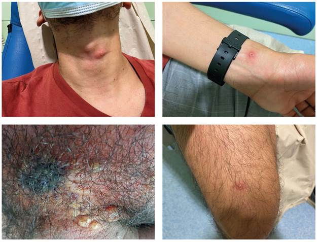 Hombre de 45 años con antecedente de infección por gonococo tratada con ceftriaxona y sin otros antecedentes relevantes que inicialmente es atendido en Atención Primaria por cuadro de conjuntivitis en ojo izquierdo, para cuyo tratamiento se le indica colirio con antibiótico. Posteriormente, vuelve a consultar en su centro de Atención Primaria porque le aparecen adenopatías inguinales bilaterales dolorosas, fiebre y clínica de balanitis. Se inicia cobertura antibiótica (clindamicina) y tratamiento antiviral (valaciclovir). No obstante, ante la persistencia de la sintomatología durante una semana, nueva lesión suprapúbica y múltiples lesiones pustulosas en cuello, brazos y piernas, el paciente acude a urgencias de hospital de zona (figura 1).
