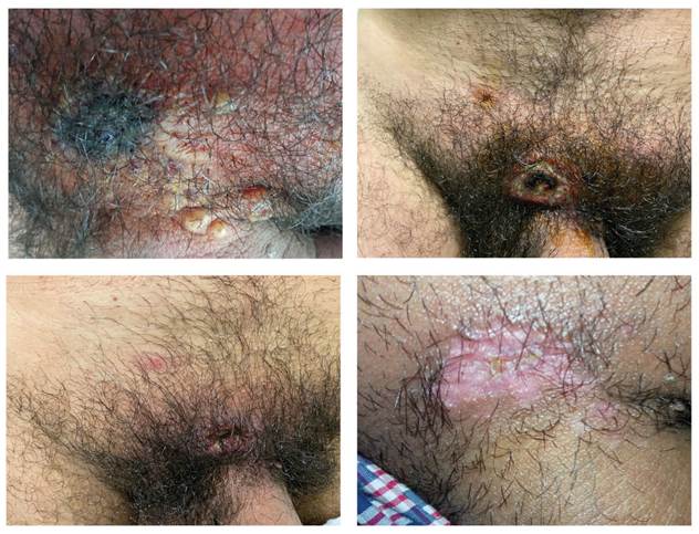Se le hace seguimiento telefónico y se observa mejoría de las lesiones pustulosas, pero un empeoramiento de la lesión suprapúbica (figura 2, fotografía superior derecha). En visita de control a los 7 días, se objetiva lesión abscesificada con signos de sobreinfección, por lo que se toma una nueva muestra para cultivo y se inicia mupirocina tópica. De la muestra de la lesión se aísla microbiota mixta y se detecta persistencia del virus de Mpox por PCR; también se solicita nuevamente cultivo uretral negativizando para Mpox.