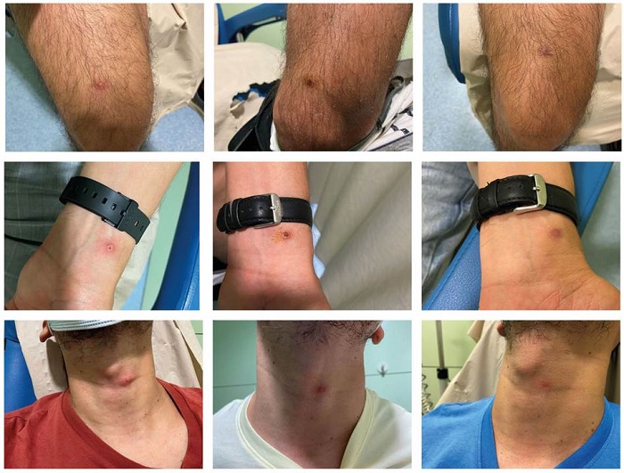 En el caso presentado, las lesiones mejoraron a las 3 semanas del inicio de los síntomas y no dejaron secuela ni cicatriz significativa, como se ha descrito en publicaciones previas2,10. La evolución de las lesiones concuerda con la descripción en la bibliografía. En la figura 3 es posible ver las distintas fases de las lesiones, algo que no suele encontrarse en las publicaciones.