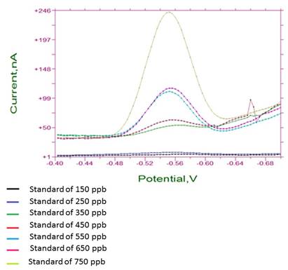 To determine the method linearity, a calibration curve was carried out with seven concentration solutions of 150, 250 and 350 ppb, from a standard of 30 ppm and 450, 550, 650 and 750 ppb, from a standard of 100 ppm and deionized water as white. 4 mL of Britton-Robinson solution and 3 mL of deionized water were added.