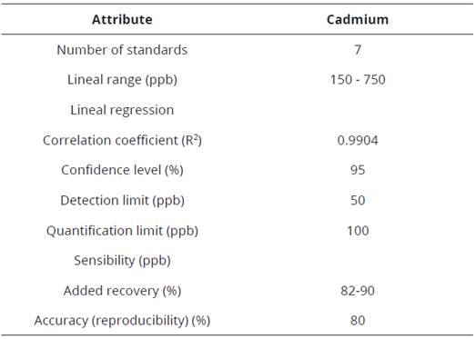 Cadmium quantification was carried out by the technique of Differential Pulse Voltammetry of Anodic Redisolution (DPVAR). A saturated solution of NaCl and deionized H2O to clean the electrode system, and working electrode was verified obtaining satisfactory results for several runs of the support electrolyte, where no interference with the polarographic method or instrumental noise was evidenced. An initial potential of -400 mV and a final potential of -800 mV, a sample deoxygenation time of 200 s (Nitrogen bubble), a scanning rate of 20 mV.s-1, a deposition time of 90 s, and a dwell time of 10s.