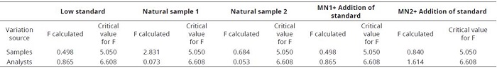 Analysis of variance (Table 2), indicated there was no statistically significant difference between the lots and between the analysts since the value of F calculated does not exceed the critical F value. The counter samples analyzed by atomic absorption spectrophotometry did not present statistical differences (P <0.05) in the Cadmium content.