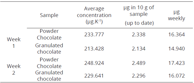 It is pertinent to conclude the mean concentrations found in each of chocolate samples do not exceed the limit established by the World Health Organization (WHO, 2006) for any of the populations within the ranges of body weight shown, but it is recommended to expand the samples number for future investigations, as this was an exploratory study.