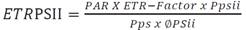 Where PAR = Photosynthetic active radiation. ETR-Factor = Ratio of photons absorbed by photosynthetic pigments to incident photons (a value of 0.84 which matches the average absorptance in the visible range of many green leaves). PPS2/PPPS = Photons absorbed by PSII relative to photons absorbed by photosynthetic pigments (A value of 0.5 is reasonable if one assumes the presence of only linear electron transport and, hence, equal electron transport rates in PSI and PSII. The ΦPSII obtained by equation 4.