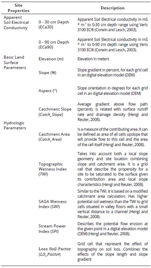 The simultaneous use of geomorphometric indices and ECa have improved the spatial prediction of soil properties (Kitchen et al., 2003). It is widely accepted that topography is considered one of the factors which determines the spatial distribution of soil properties. As a result, numerous studies have reported the predictive potential of these indices on the spatial model of soil properties (Lagacherie, 2008). However, there is no evidence about the simultaneous use of geomorphometric indices and ECa to modeling ESD limited by tosca.