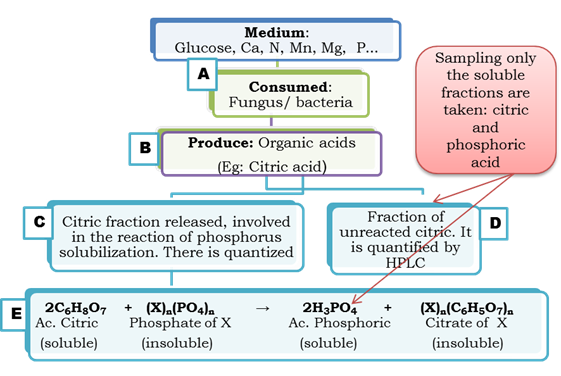 As can be shown, from the culture medium and microbial inoculation (Figure 1 A), the organic acids (B), are produced by part of them, in addition, participate in the solubilization reaction (C) and the remaining, is soluble in the solution (D), the latter, which is determined by HPLC and analyzed statistically, produce the unfavorable findings above mentioned.