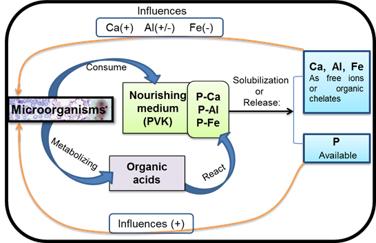 When P is stored in inorganic molecules, their availability occurs by a solubilization processes related to the dissolution properties of mineral and medium acidification. Microorganisms influence soil pH by absorption of NH4+, where these protons ejected to compensate the potential difference in the membrane and acidify the soil. Acidification has also been associated with the presence of CO2 generated during respiration of both roots and microorganisms (Jones & Oburger, 2011).