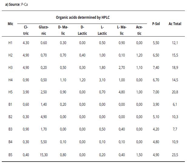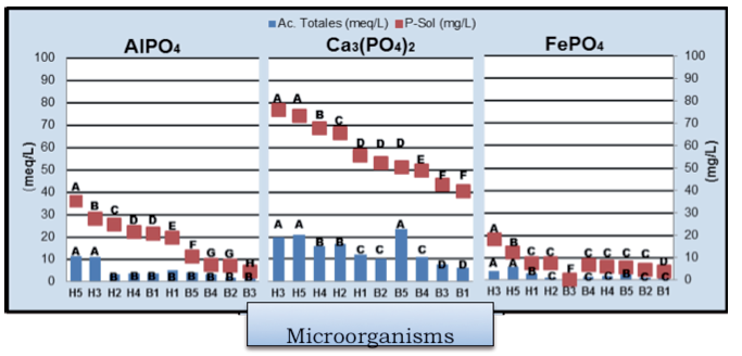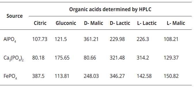 The phosphate source of microorganisms, showed higher production of organic acids (P-Ca> P-Al> P-Fe), which coincides with the greatest amount of soluble phosphorus.